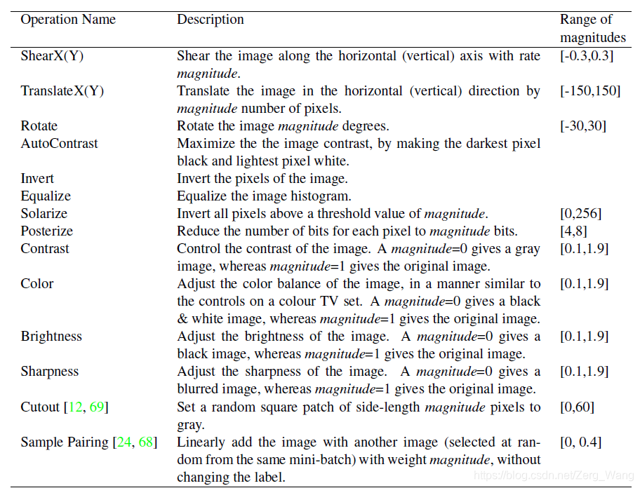 子策略:由2个上文提到的增强操作组成,其中,每个操作由2个参数组成:probability和magnitude,分别是使用该操作的可能性以及该操作的使用幅度。不是所有的操作都需要magnitude,比如AutoContrast操作作者就规定其参数为0,但形式上这些操作仍会保留magnitude参数。此外,对于几何变换类的操作(Shear、Translate、Rotate),虽然有magnitude参数规定了操作幅度,但方向是随机的。例如旋转45度,在增强时可能会逆时针旋转45度,也可能顺时针旋转45度。