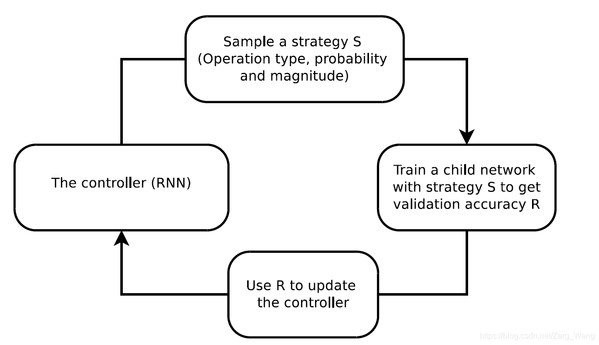 增强策略:多个子策略组成一个完整的增强策略。作者的实验中规定了每个完整策略由5个子策略构成。